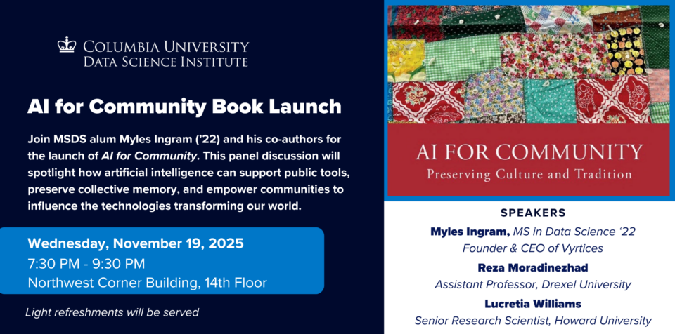 Join MSDS alum Myles Ingram (’22) and his co-authors for the launch of AI for Community.