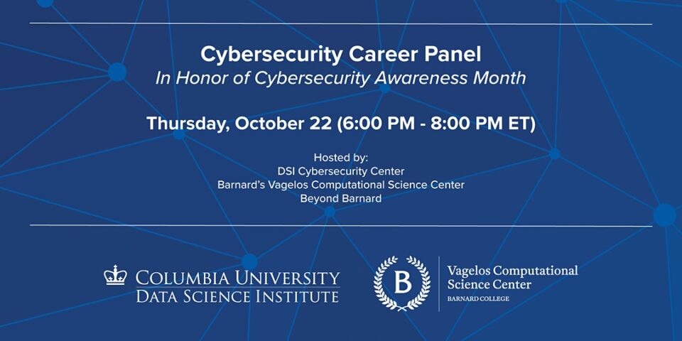 Learn about careers in cybersecurity. The Cybersecurity Center at the Data Science Institute, in conjunction with Barnard’s Vagelos Computational Science Center and Beyond Barnard, is hosting a Cybersecurity Career Panel. Join to explore careers in cybersecurity and the pathways to them! Panelists will include a number of cybersecurity professionals, who will describe their current roles and their career paths, and take your questions.
